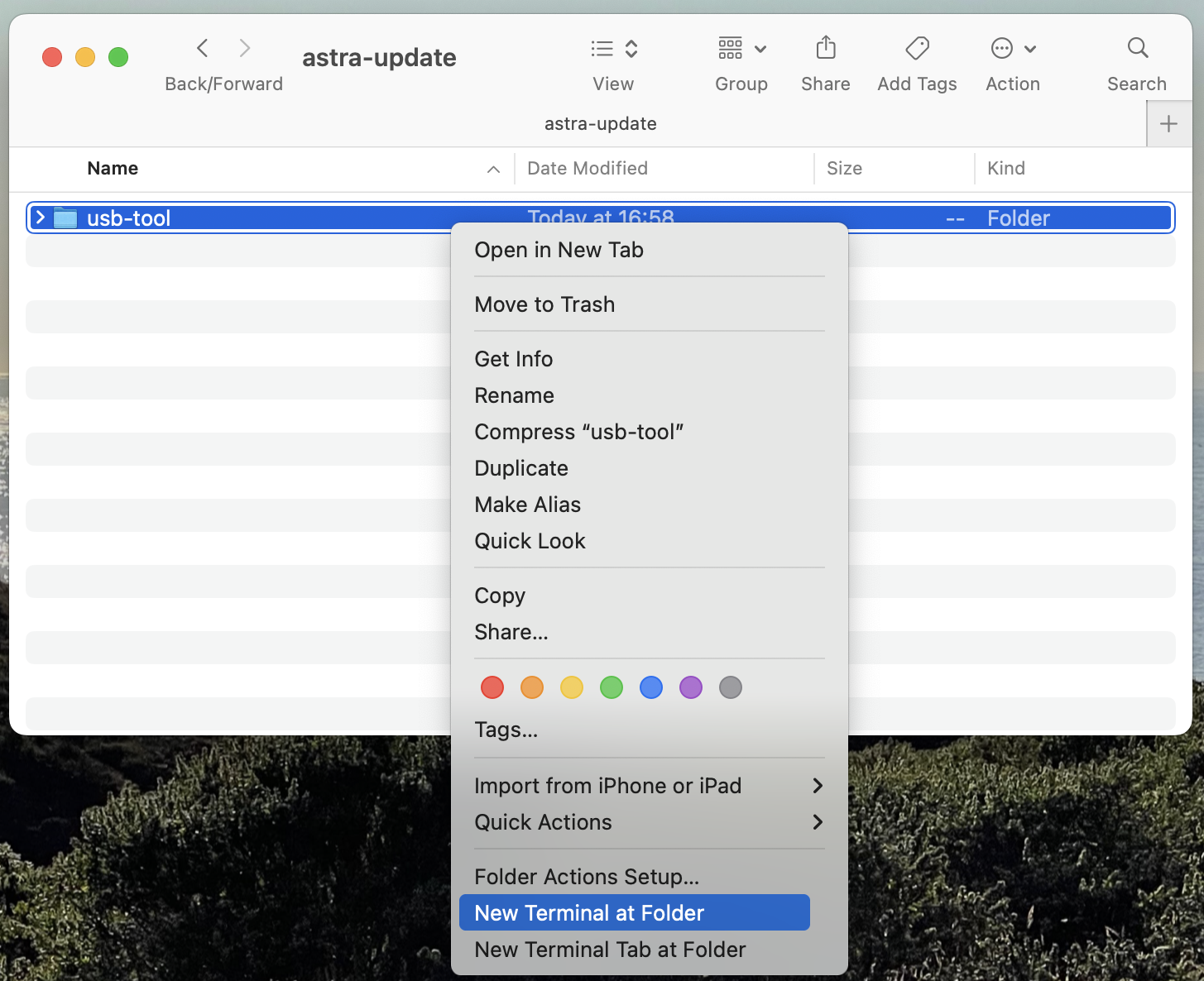 On Mac OS, right click on the usb-tool directory. From the drop down select Services -> New Terminal at Folder.